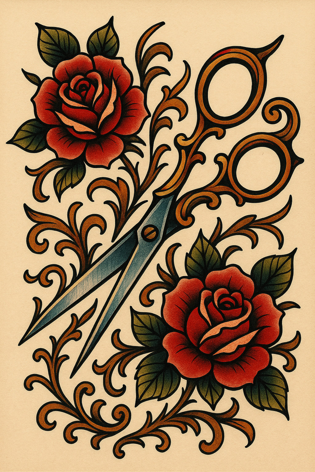 This image features a vintage tattoo style illustration of ornate scissors surrounded by vibrant red roses. The design is bold and colorful, suitable for tattoo art or decorative purposes.