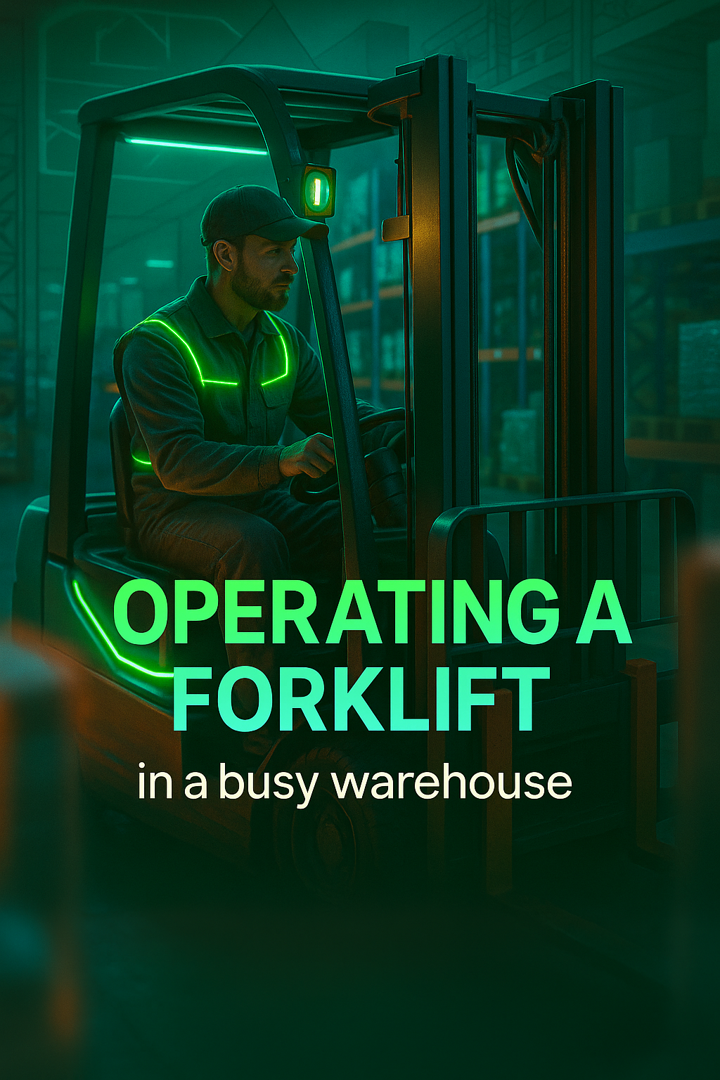 /Collection: /by davooda/Type: PNG/Vivid digital artwork depicting a warehouse scene with a forklift operator. The neon accents and realistic details create an engaging atmosphere, suitable for training materials or industry promotions.