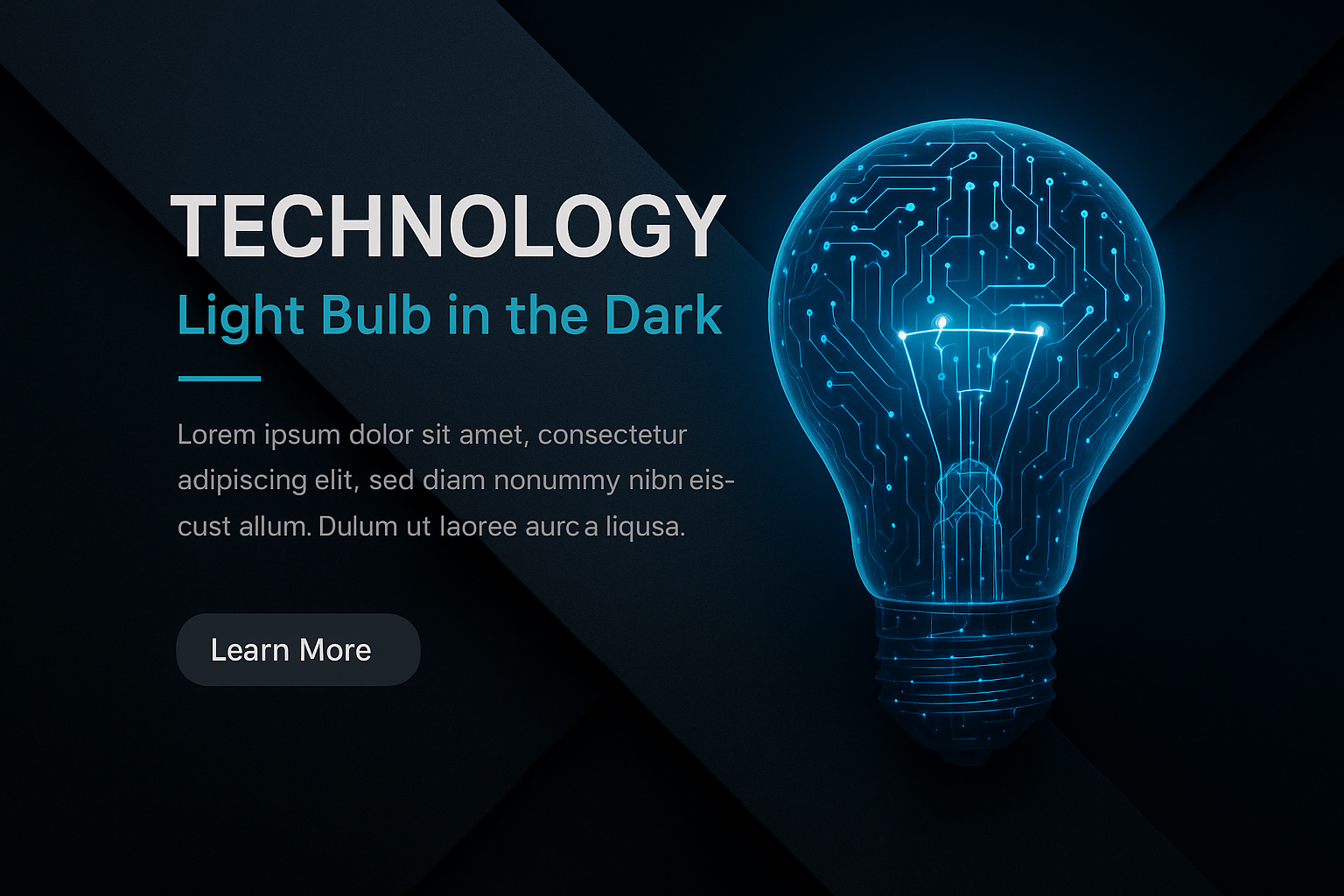 /Collection: /by davooda/Type: PNG/A glowing light bulb with circuitry patterns stands out against a dark background, emphasizing the theme of technology. The design features layered geometric shapes and a clear call-to-action button.