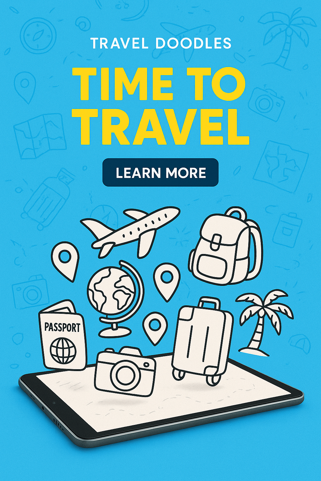 /Collection: /by davooda/Type: PNG/A vibrant illustration featuring travel-related doodles emerging from a tablet. The design includes elements like an airplane, globe, and passport, set against a bright background with playful typography.