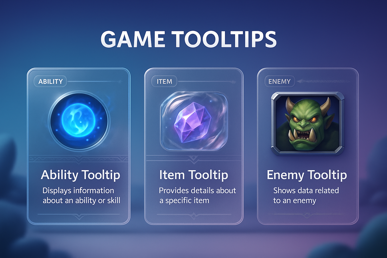A visually engaging 3D illustration featuring three distinct tooltips for gaming abilities, items, and enemies, set against a smooth gradient background.