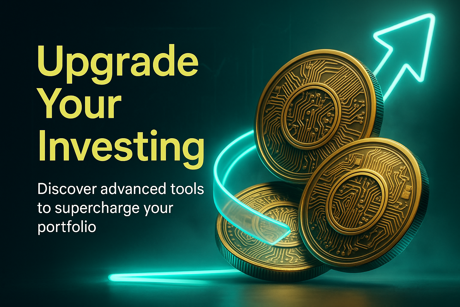 /Collection: /by davooda/Type: PNG/Dynamic promotional image showcasing digital coins with a glowing upward arrow, emphasizing advanced investment tools aimed at enhancing portfolio performance.