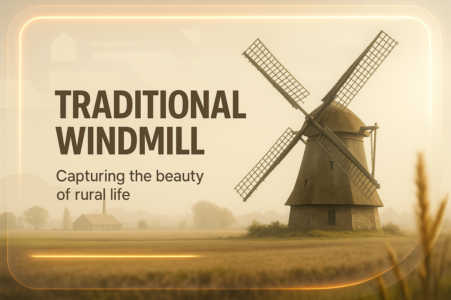 A serene image showcasing a traditional windmill set against a misty rural landscape, emphasizing the beauty of nature and rural life. The warm tones and soft focus create a tranquil atmosphere.