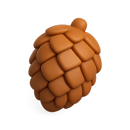A 3D-rendered stylized pine cone featuring smooth, rounded scales in a warm brown hue. Ideal for use in nature-themed graphics, product designs, or digital art projects.
