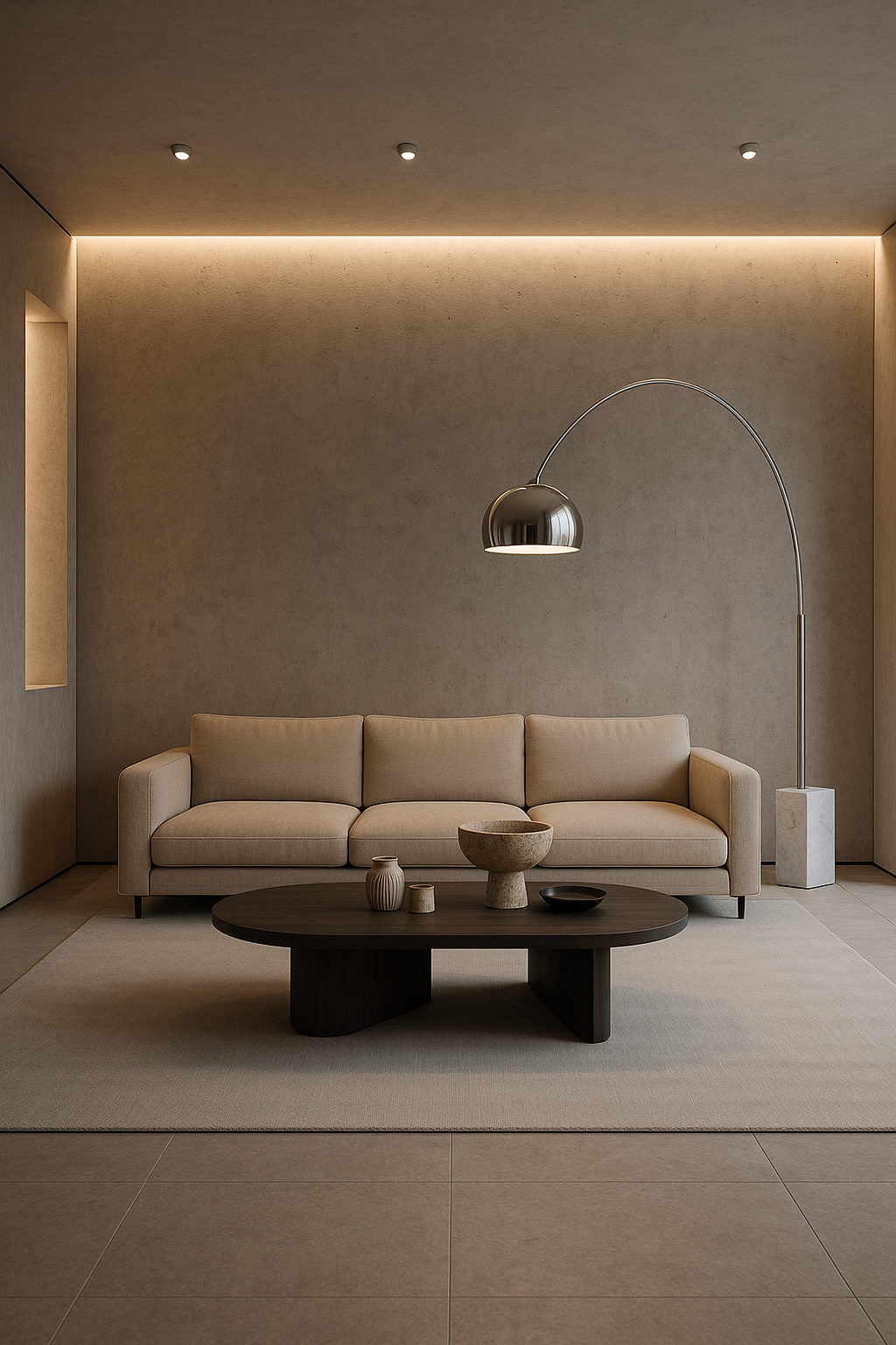 A sleek, modern minimalist living room featuring soft ambient lighting, a neutral color palette, and elegant Italian design elements. The space includes a cozy sofa, stylish coffee table, and textured walls.