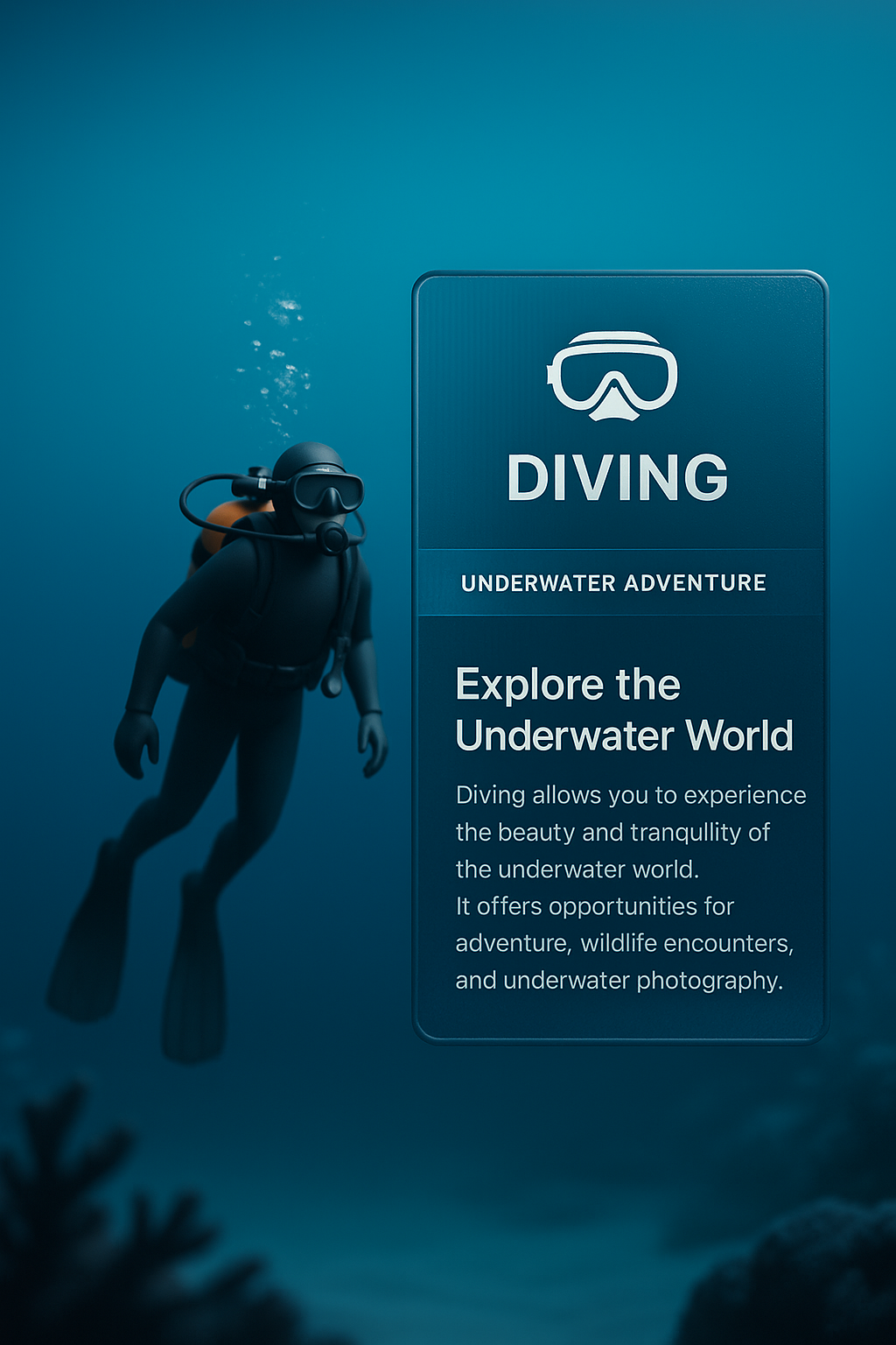 A visually captivating 3D illustration featuring a diver exploring the serene underwater world. The design includes a transparent panel with text, enhancing the overall aesthetic.