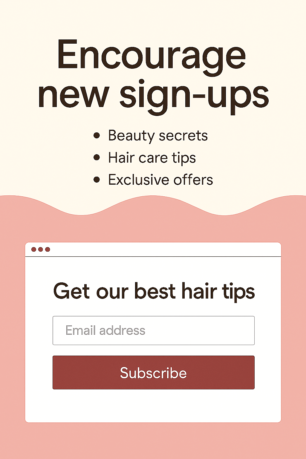 A promotional graphic designed to encourage new sign-ups for hair care tips. It features a clean layout with a subscription form and a soft color palette, ideal for beauty and wellness brands.