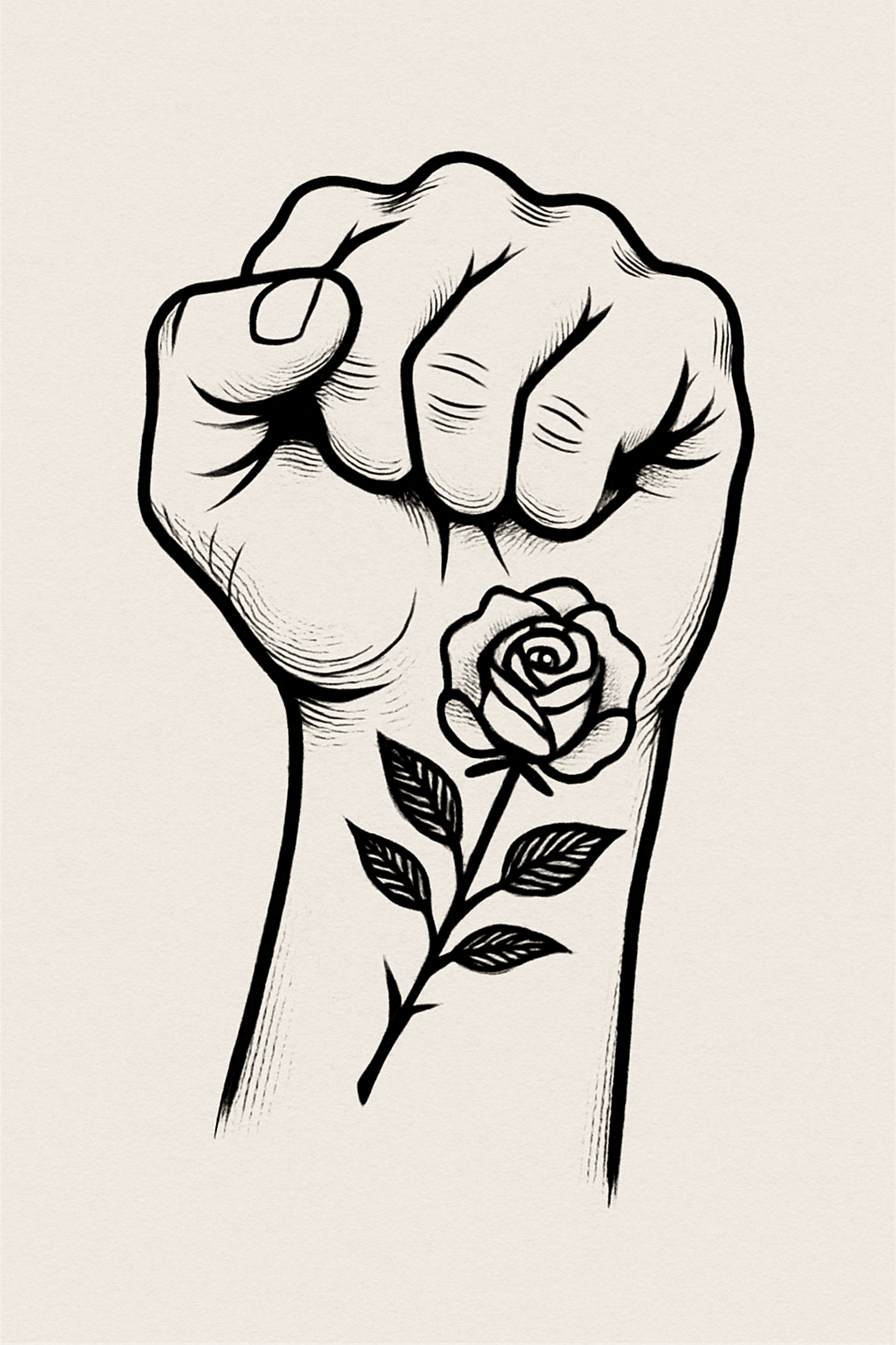 This graphic features a stylized illustration of a clenched fist with a rose tattoo. It has a minimalist design, ideal for tattoo art or empowerment themes.