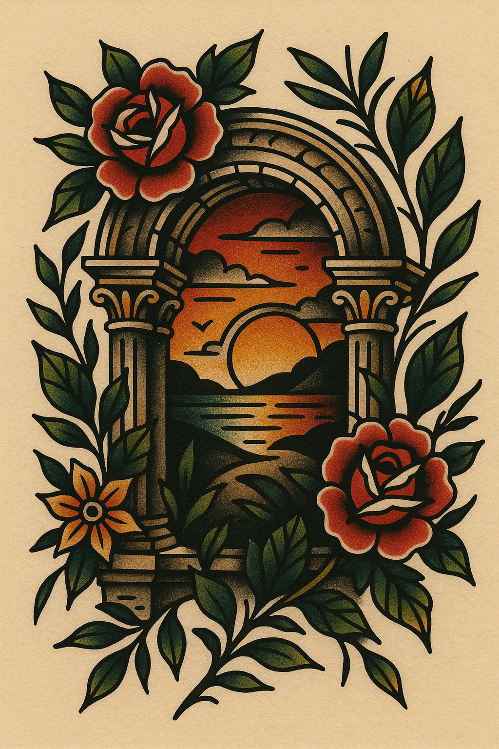 /Collection: /by davooda/Type: PNG/This is a vibrant illustration featuring a sunset view through an ornate arch, surrounded by floral elements. The style is reminiscent of classic tattoo art, designed for decorative purposes.