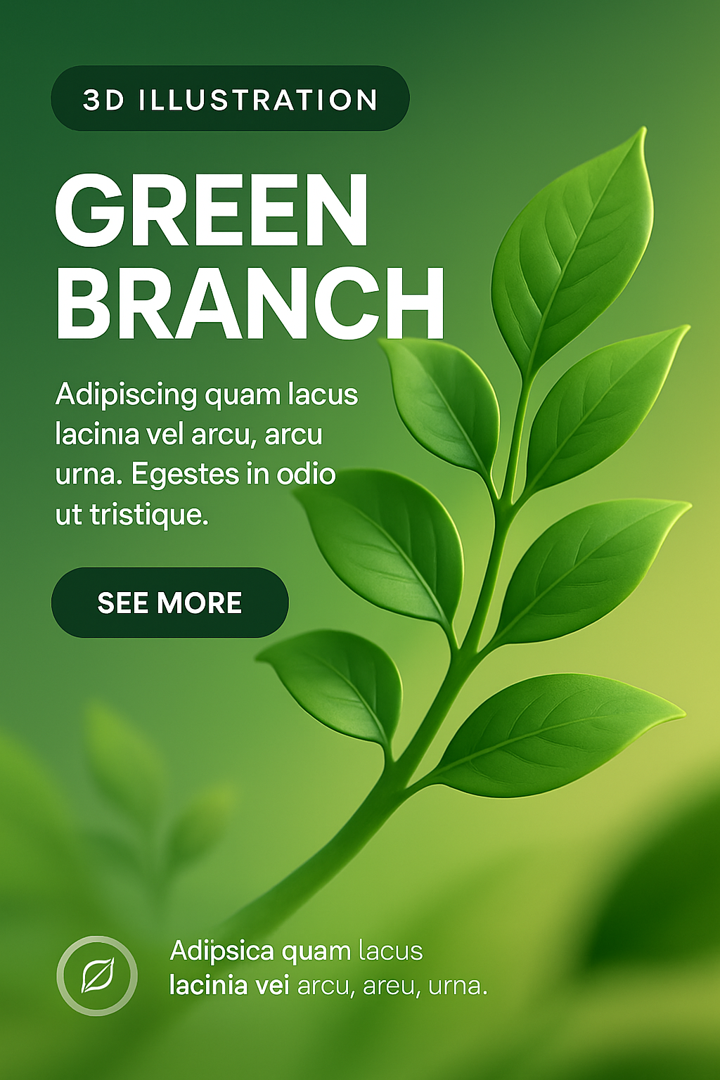 /Collection: /by davooda/Type: PNG/This image features a 3D illustration of a green branch with lush leaves, designed for nature-themed content. Its modern style and gradient background enhance visual appeal, suitable for digital marketing or eco-friendly themes.