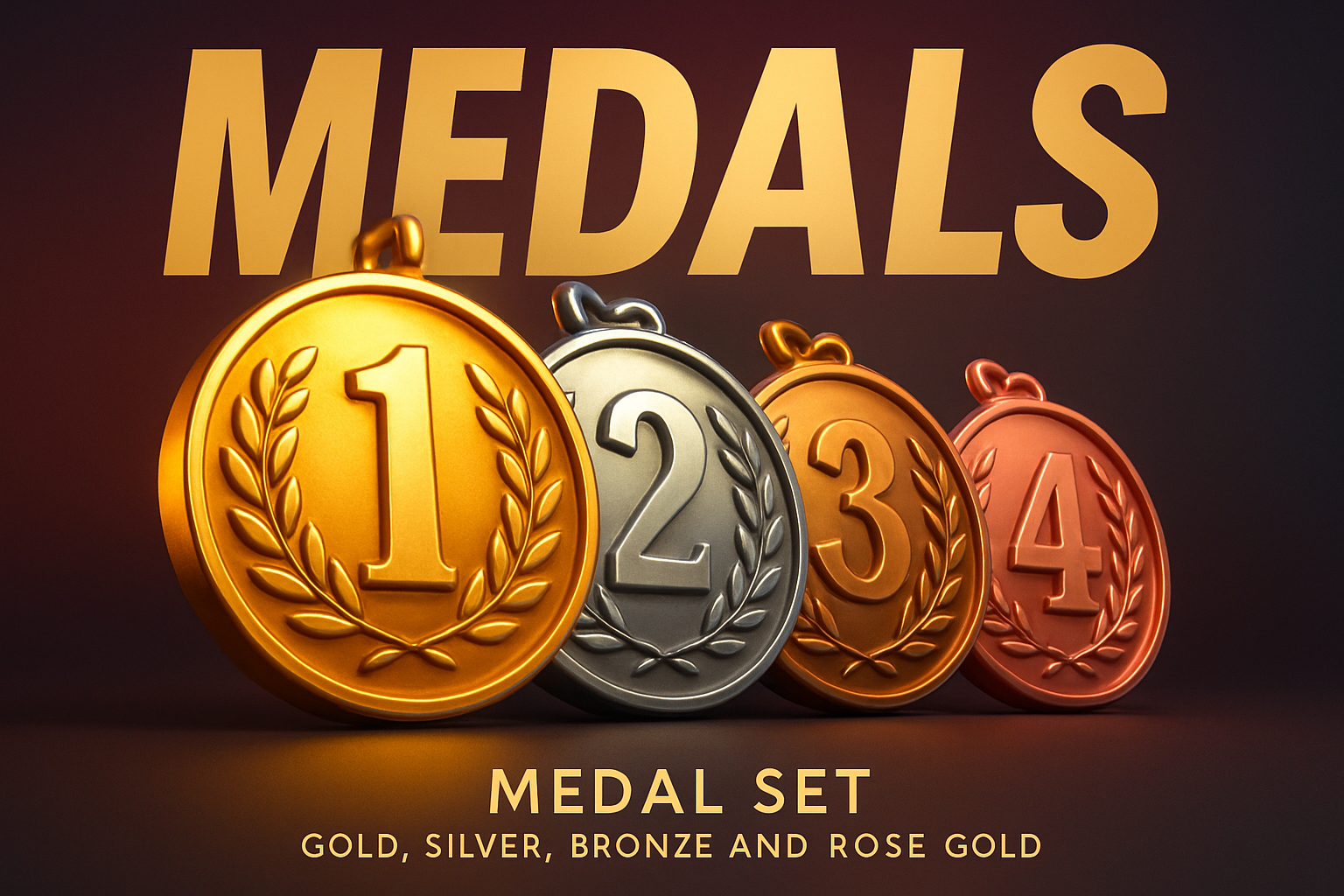 A striking 3D render of a gold, silver, bronze, and rose gold medal set, featuring dramatic typography and a gradient background. The medals showcase laurel designs and numbers, emphasizing a competitive spirit.
