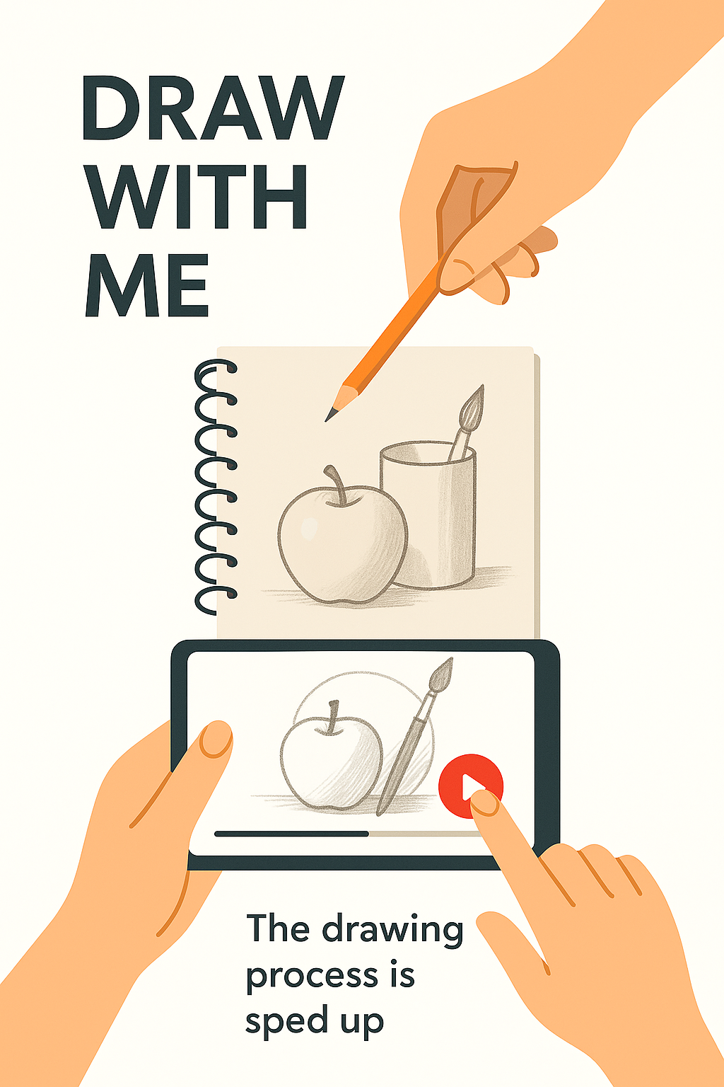 /Collection: /by davooda/Type: PNG/A creative graphic showcasing a drawing tutorial. It features hands holding a sketchbook and a tablet, emphasizing the drawing process and engagement with art. Ideal for art education or social media content.