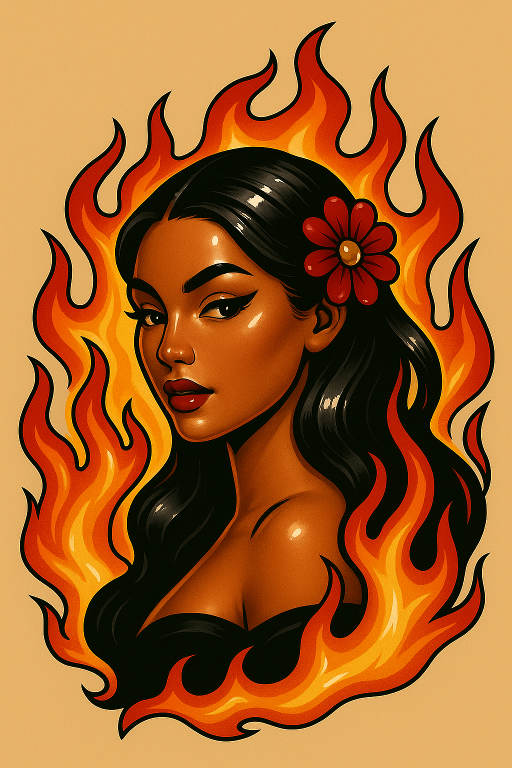 /Collection: /by davooda/Type: PNG/This image features a glamorous depiction of a woman with long, flowing hair, surrounded by vibrant flames. The art style resembles classic tattoo aesthetics, enhanced with glossy anime-like highlights against a soft beige background.