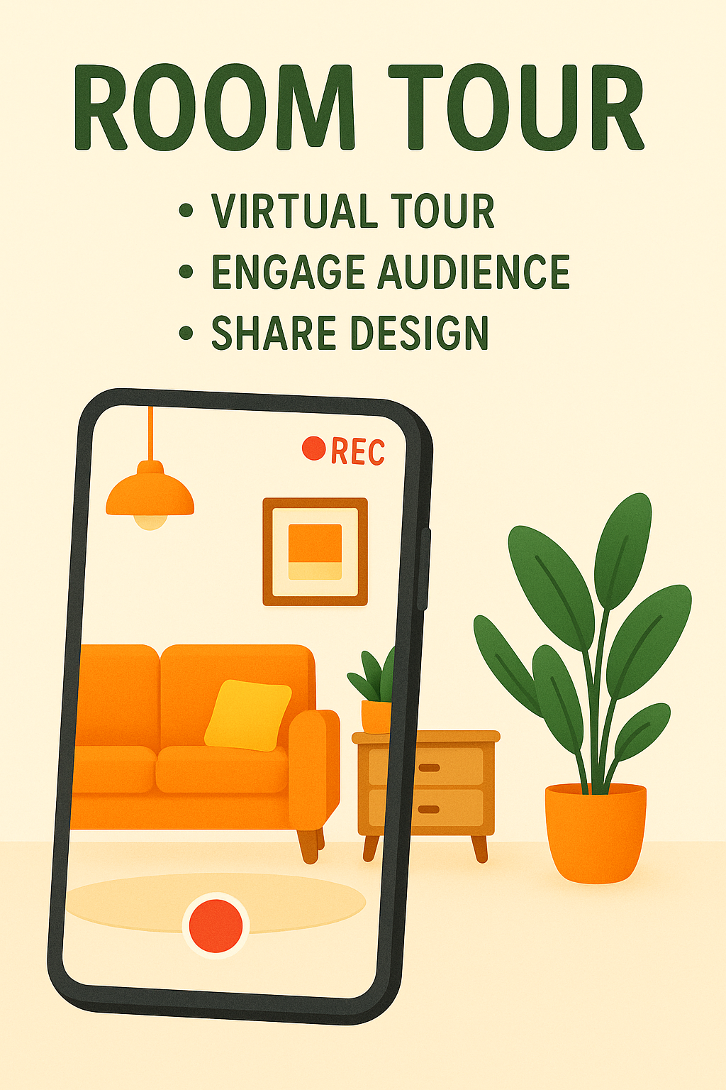/Collection: /by davooda/Type: PNG/A visually engaging graphic depicting a smartphone recording a virtual room tour, featuring a cozy living room scene. Ideal for social media and marketing content aimed at interior design enthusiasts.