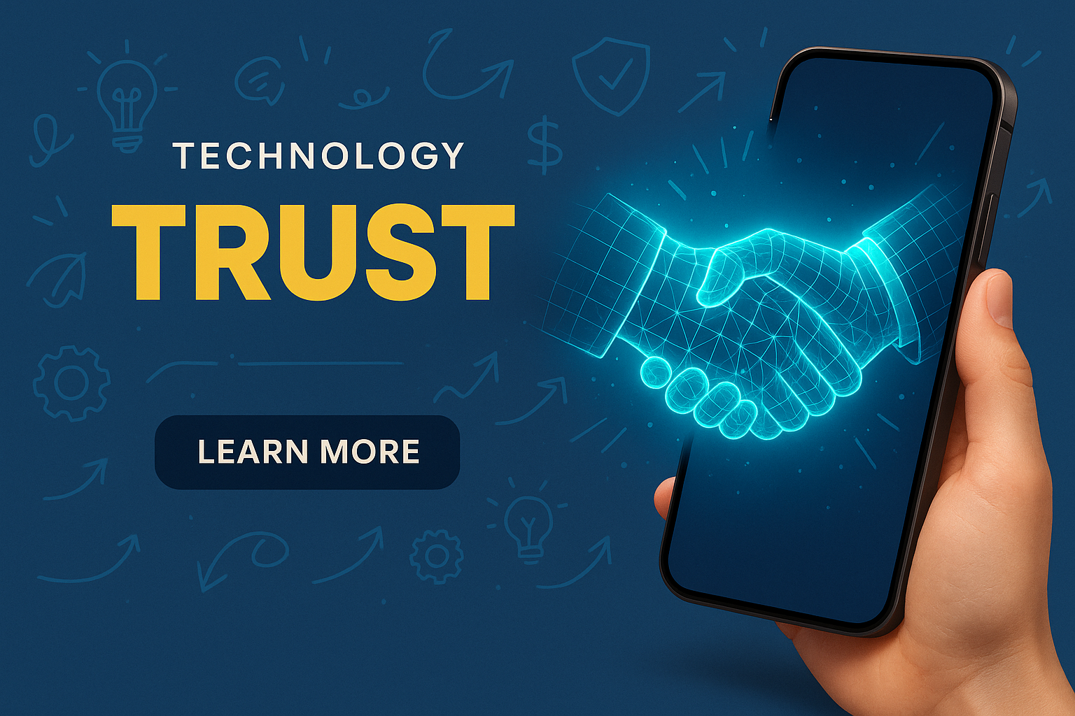 /Collection: /by davooda/Type: PNG/A modern illustration featuring glowing wire-frame hands engaging in a handshake, emerging from a smartphone. The design emphasizes technology and trust in business.