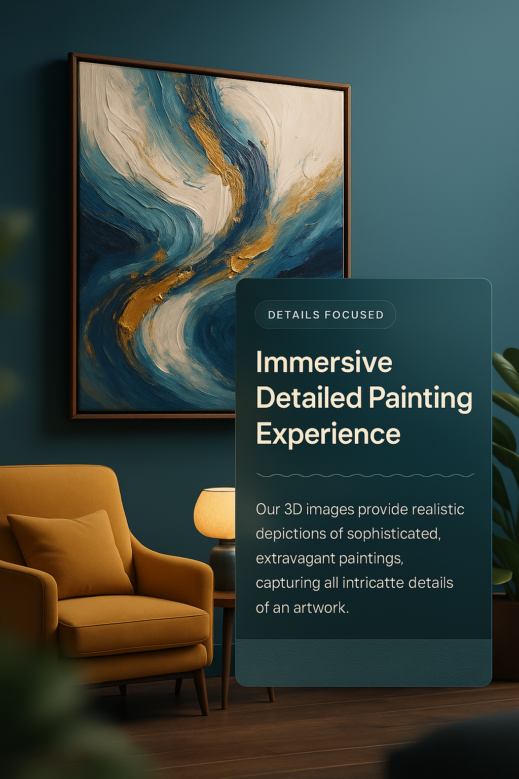A modern living room with a large abstract painting on the wall, complemented by stylish furniture. The design emphasizes depth and realism with a gradient background.