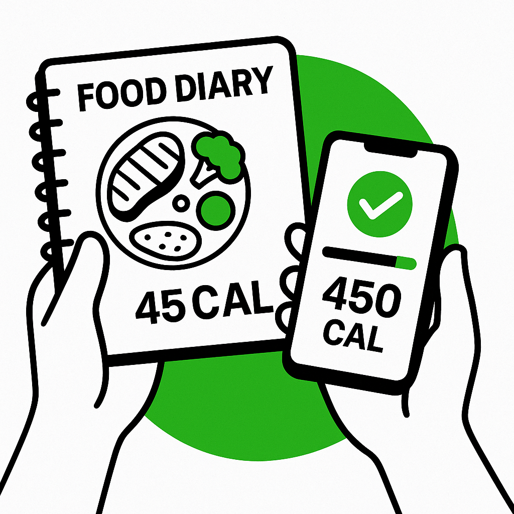 Minimalist illustration depicting a food diary and a smartphone app for tracking calorie intake, ideal for health and wellness content.