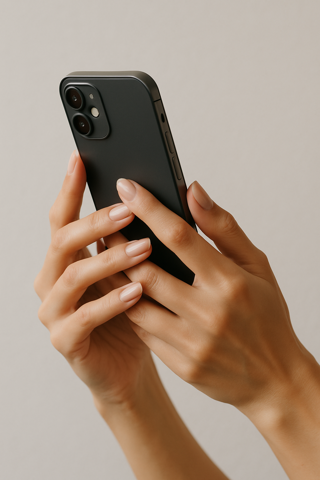 Aesthetic close-up image featuring a pair of hands holding a smartphone against a neutral background. Ideal for tech and lifestyle branding.