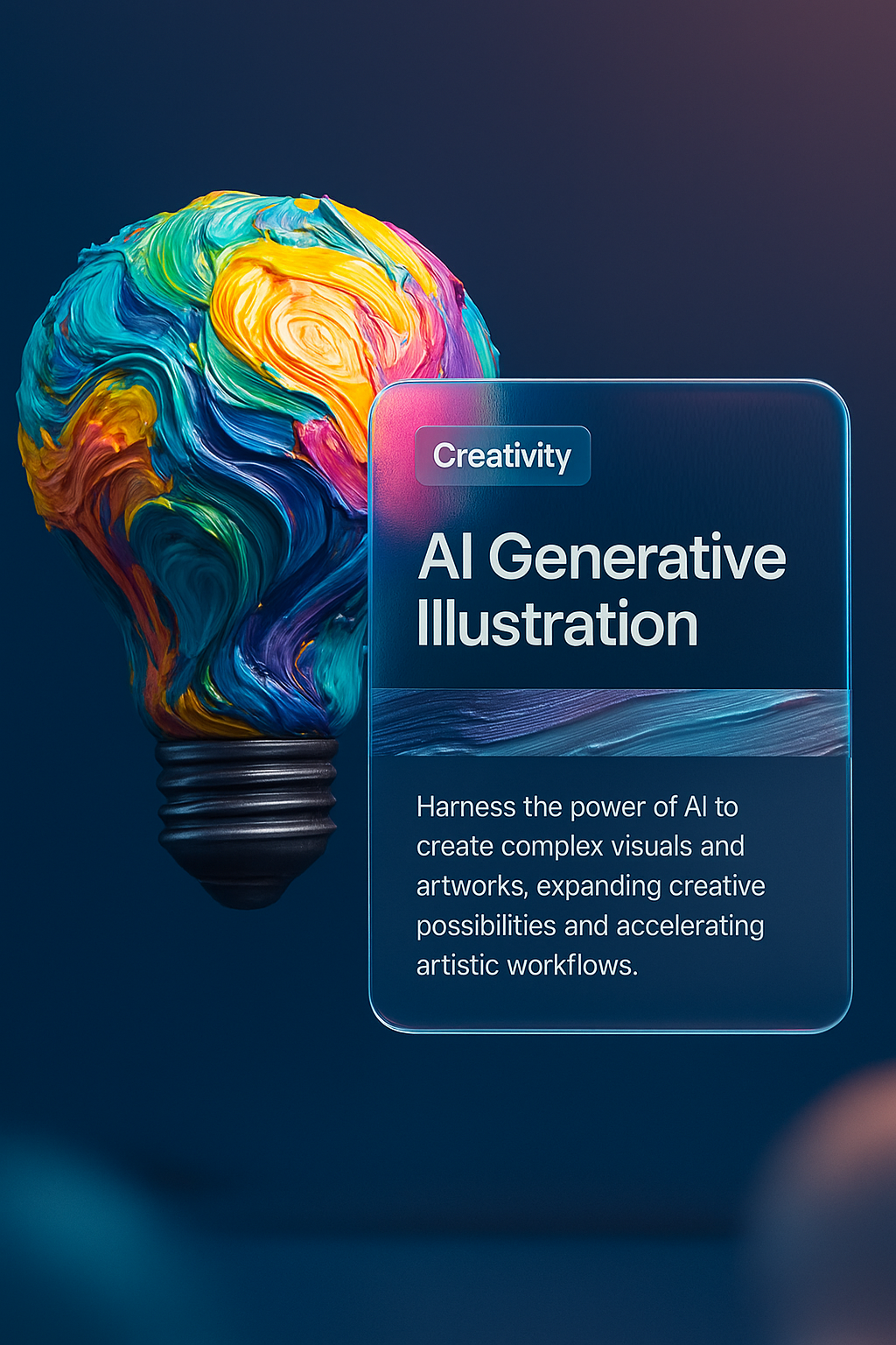 /Collection: /by davooda/Type: PNG/A vibrant 3D illustration of a lightbulb made from a colorful oil paint mix. It features a sleek text box with information about AI generative art, emphasizing creativity.