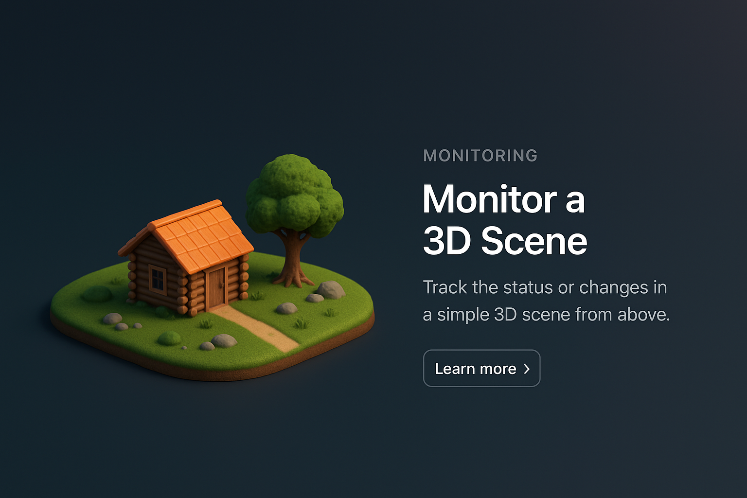 /Collection: /by davooda/Type: PNG/A zoomed-out 3D scene featuring a small cabin and tree on a grassy patch, set against a dark gradient background. Text elements include a header and call-to-action.