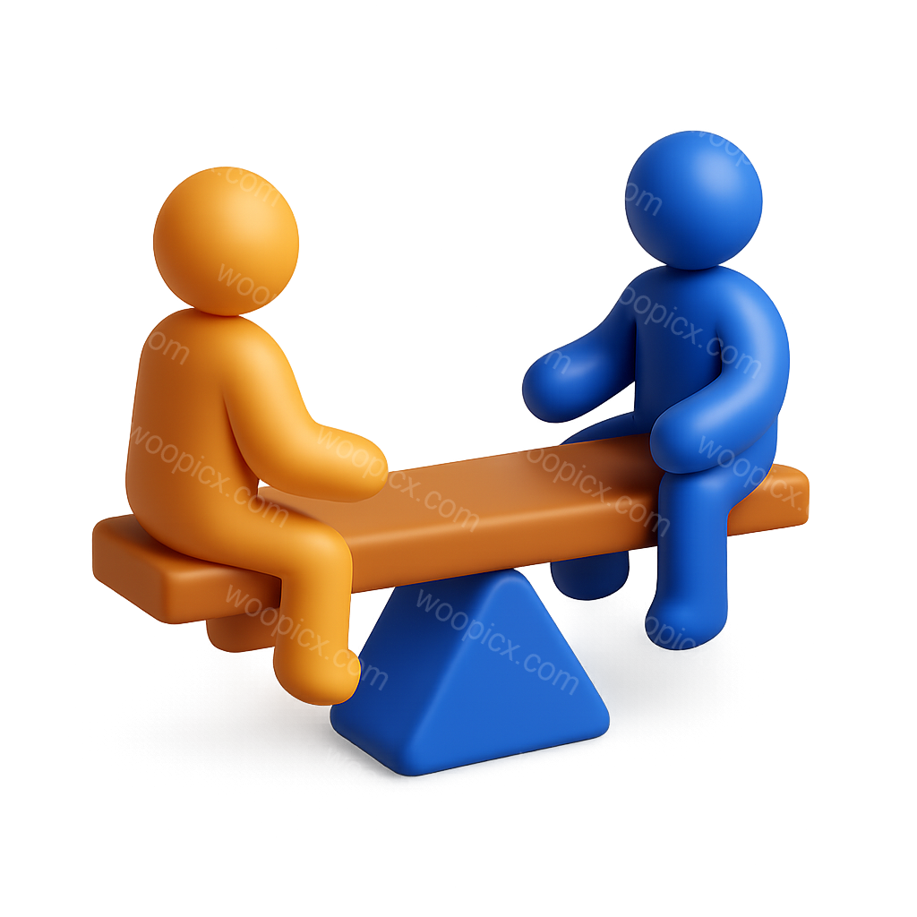 A vibrant 3D icon depicting two stylized figures in an isometric view on a seesaw. One figure is orange and the other is blue, set against a gradient background.
