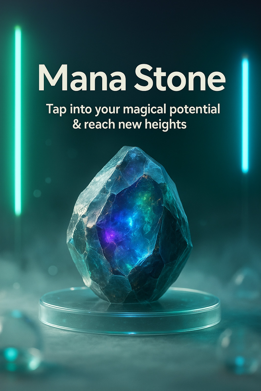 A visually engaging carousel slide featuring a glowing mana stone, with neon accents and captivating text elements inviting viewers to explore their potential.