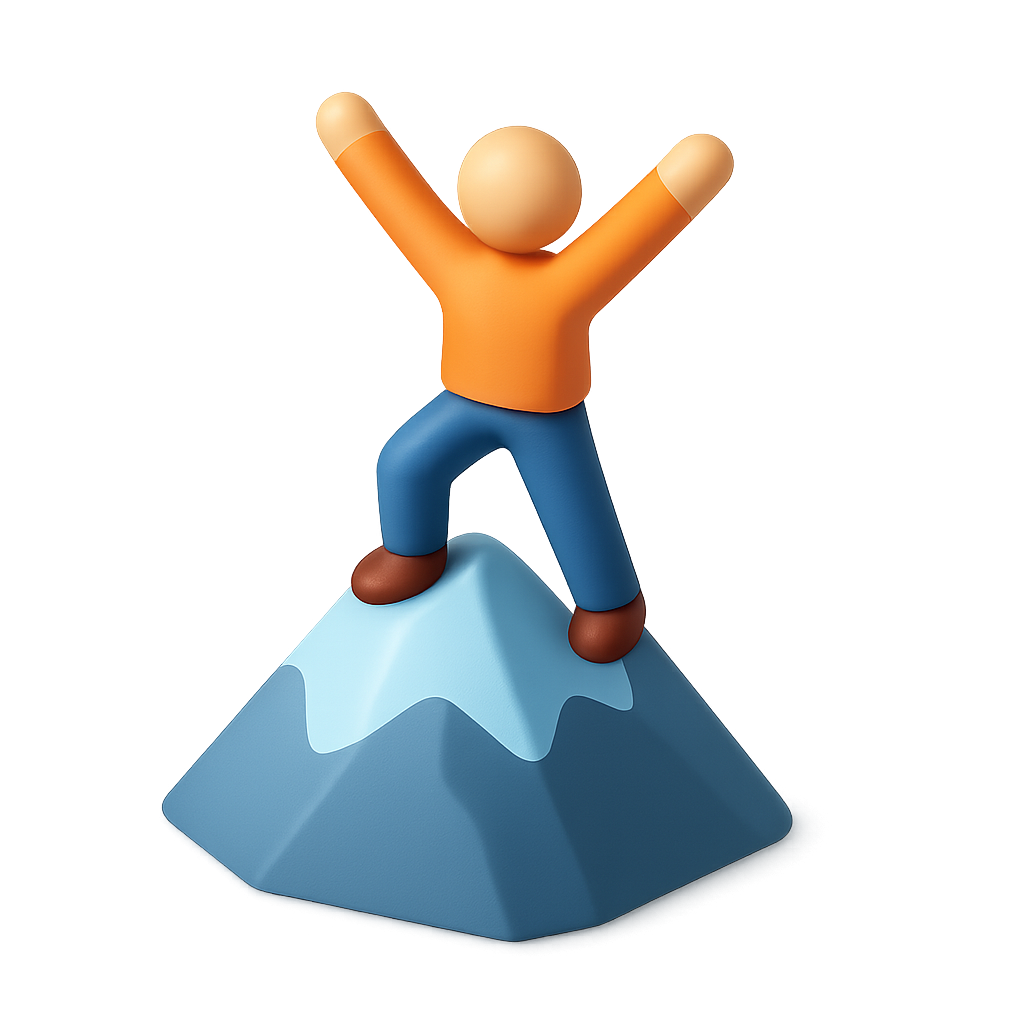 /Collection: /by davooda/Type: PNG/A colorful 3D icon depicting a person with raised arms celebrating on top of a stylized mountain. The figure is designed with a vibrant orange shirt and blue pants, showcasing a playful isometric style.