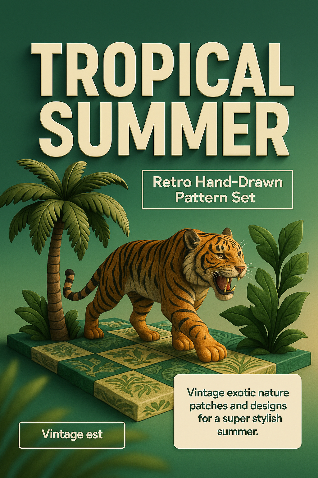 A retro hand-drawn seamless pattern featuring a tiger amidst lush palm trees. The design showcases a vintage aesthetic perfect for summer textiles.