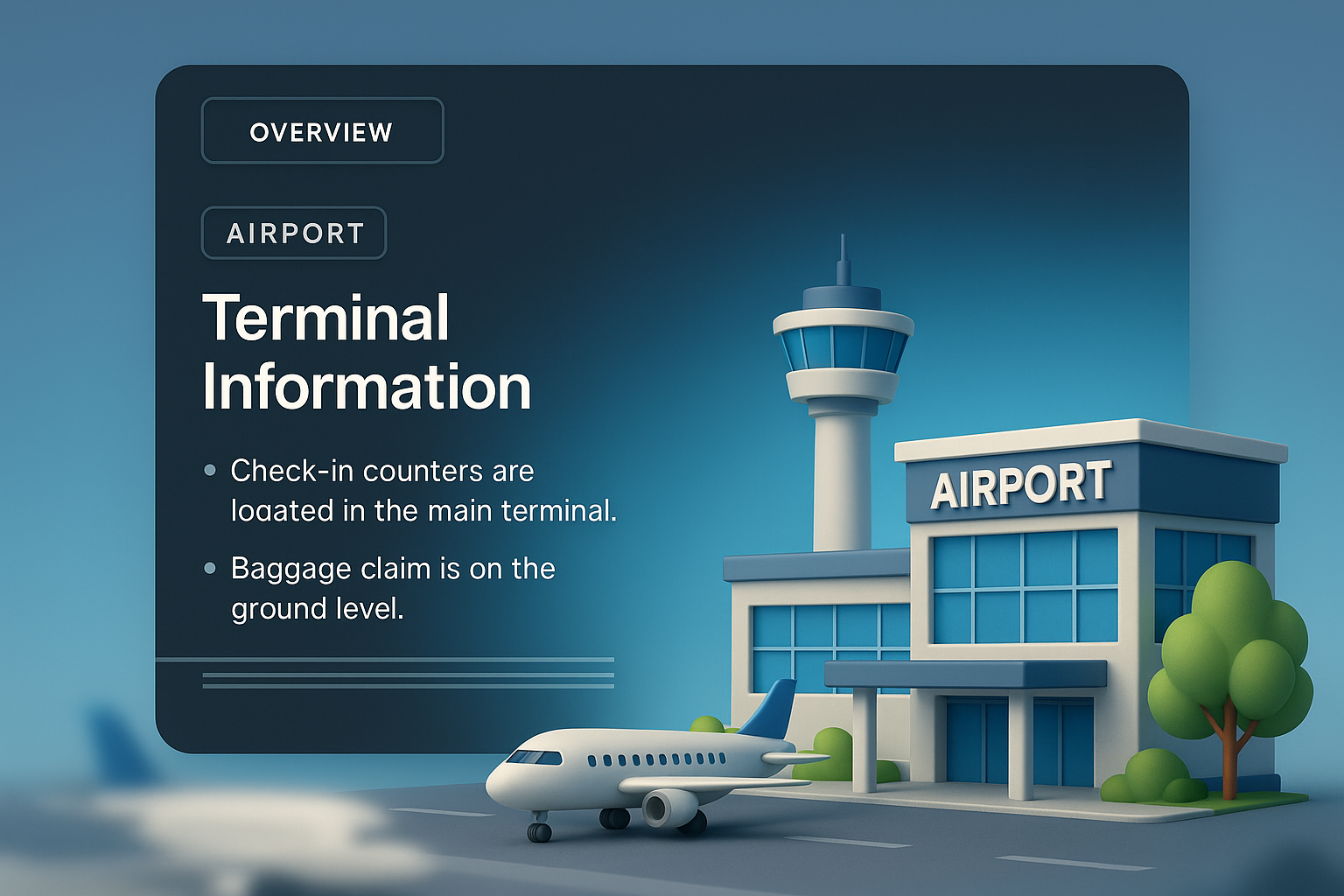 /Collection: /by davooda/Type: PNG/A vibrant 3D illustration of an airport featuring a control tower, terminal building, and an airplane. The design includes integrated blocks for terminal information.