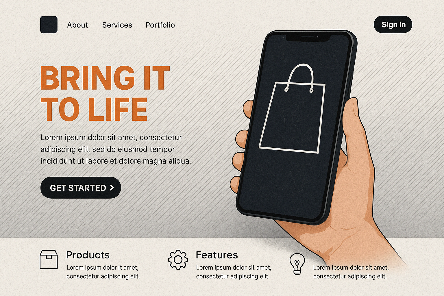 /Collection: /by davooda/Type: PNG/A visually appealing landing page featuring a smartphone displaying a shopping bag icon. The layout includes bold typography, action buttons, and product sections.
