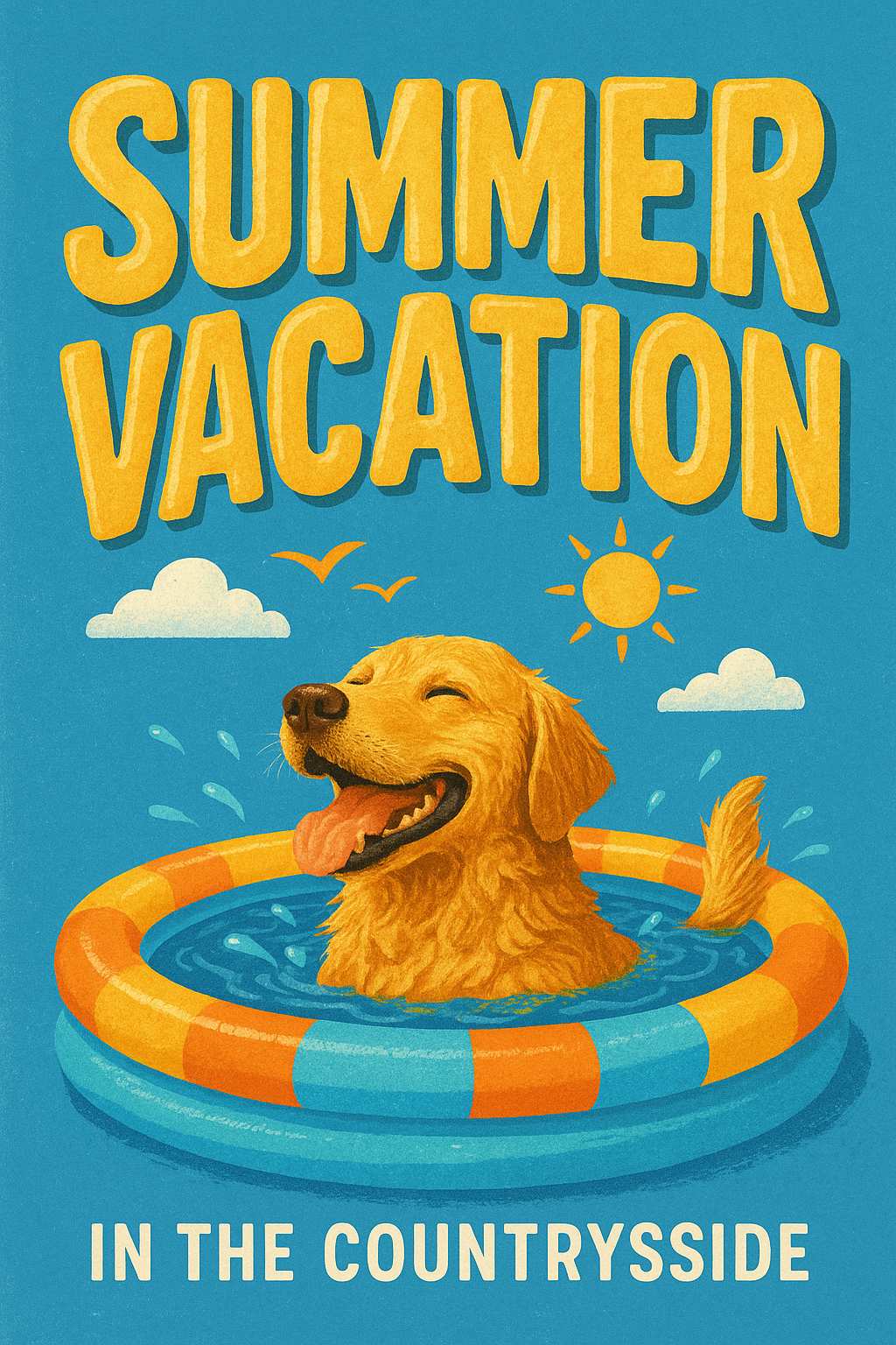 Colorful and cheerful promotional poster depicting a happy dog enjoying a summer vacation in a pool, ideal for travel or pet-related themes.