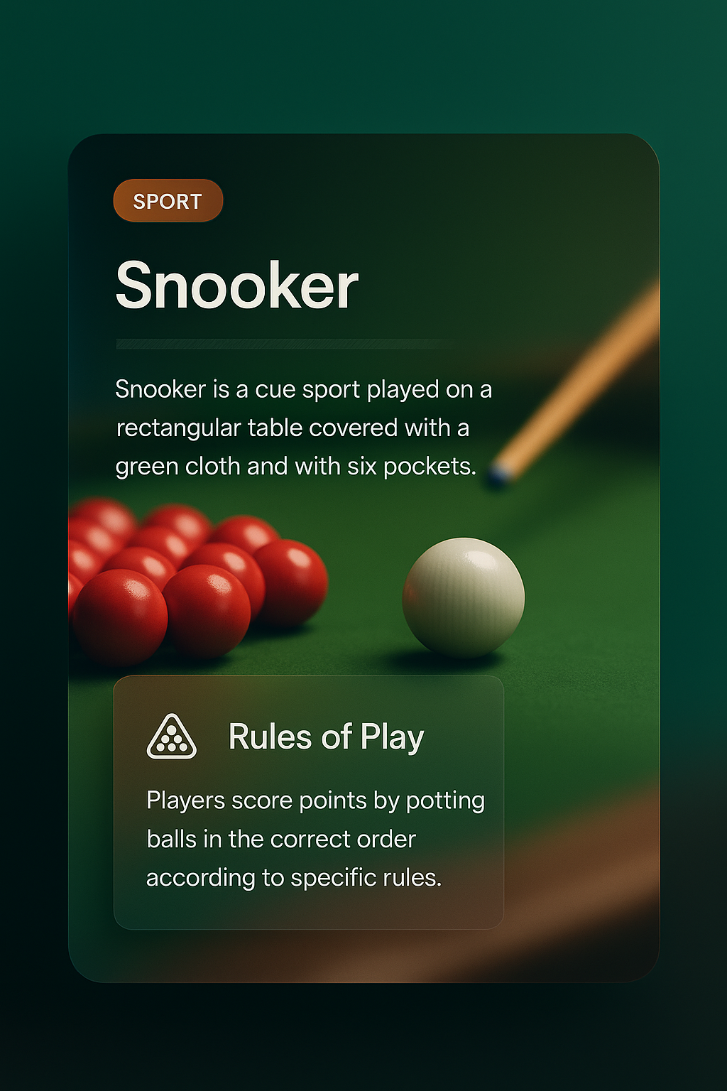 This image features a snooker-themed design, showcasing a cue sport setting with vibrant red balls, a white cue ball, and a green table. Integrated text blocks provide information about the game.