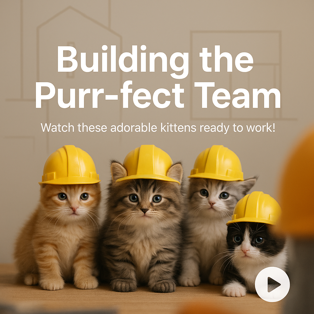 /Collection: /by davooda/Type: PNG/Charming image featuring four kittens wearing construction helmets, perfect for a light-hearted team building theme or social media post aimed at cat lovers.