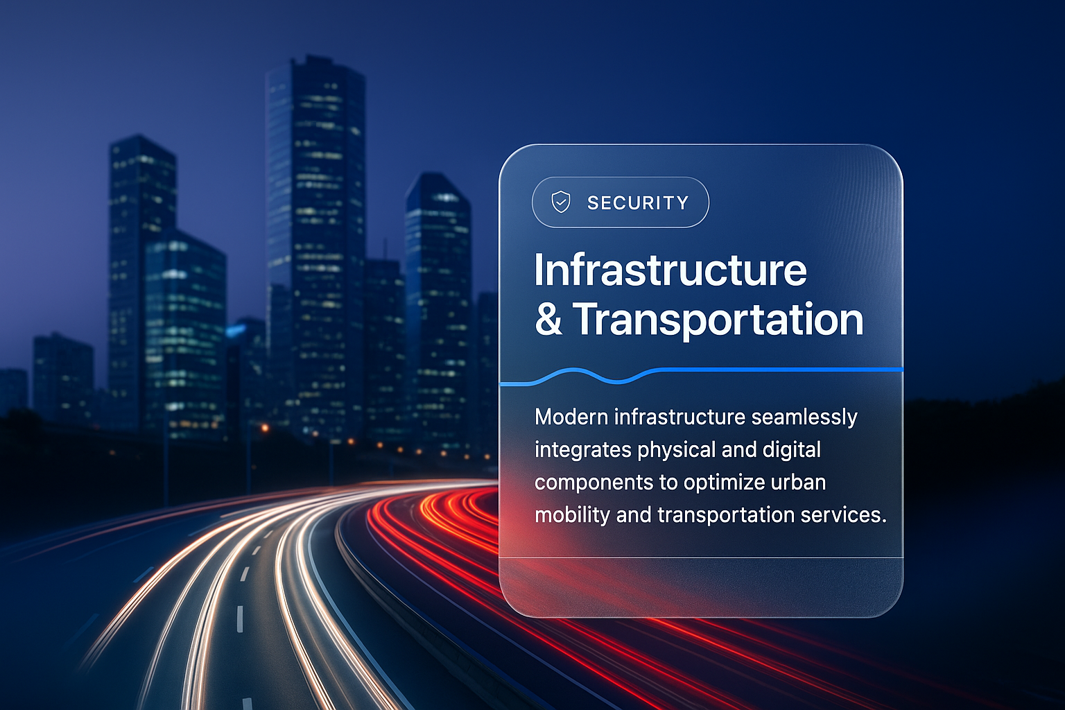 /Collection: /by davooda/Type: PNG/A dynamic urban scene featuring skyscrapers illuminated against a twilight sky, with vibrant light trails from moving vehicles. The foreground includes a transparent info block highlighting urban infrastructure and transportation.