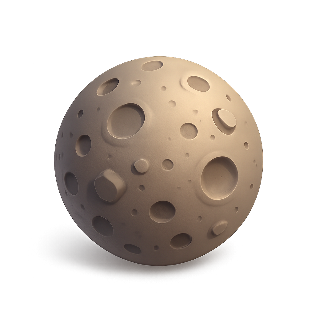 A realistic 3D representation of a moon icon featuring various craters and textures. The spherical shape casts a soft shadow, enhancing its three-dimensional appearance.