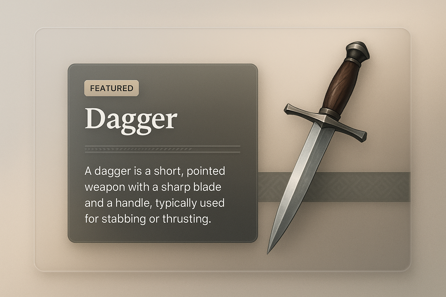 A realistic depiction of a dagger alongside a sleek information overlay explaining its use. The design features a gradient background and a modern aesthetic.