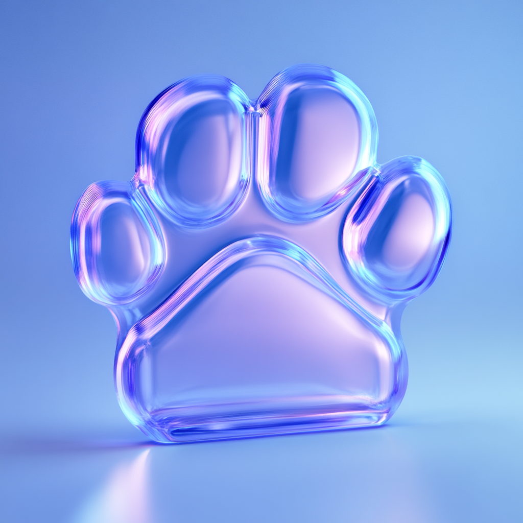 A modern 3D representation of a paw print icon, featuring a translucent design with soft gradient colors. Ideal for pet-related branding or websites.