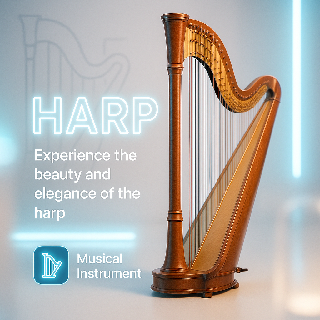 A visually striking image of a wooden harp set against a modern backdrop with neon elements, ideal for promoting musical instruments and their beauty.