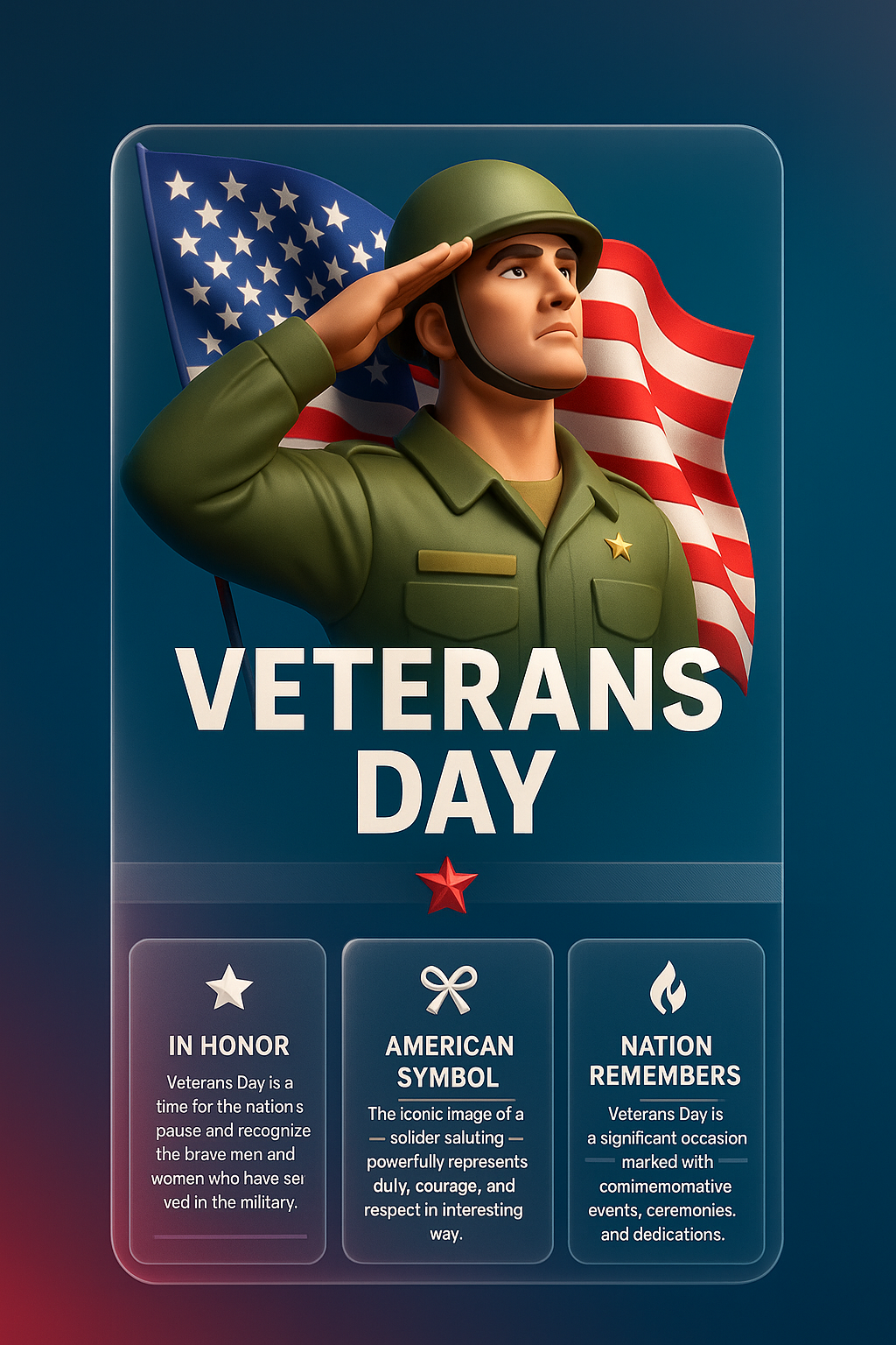 A dynamic 3D illustration featuring a soldier saluting in front of the American flag, with informative blocks detailing Veterans Day's significance and symbols.