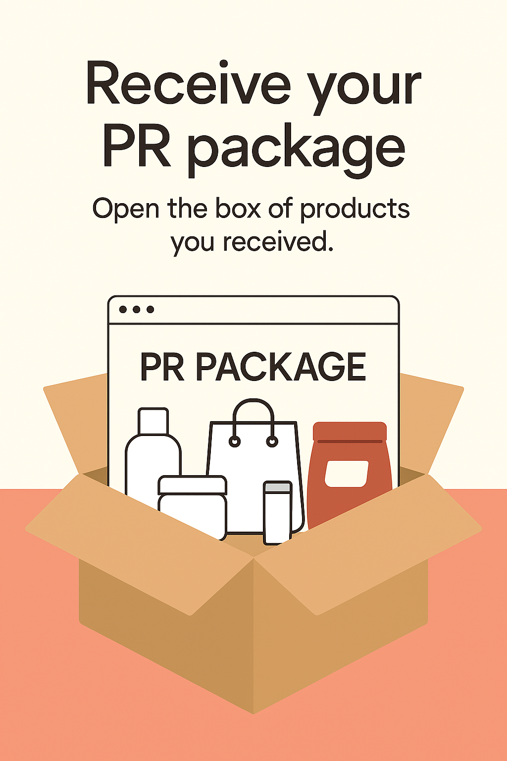 A clean and modern illustration depicting a PR package being opened, highlighting various products in a box. Ideal for promotional content related to product launches and influencer marketing.