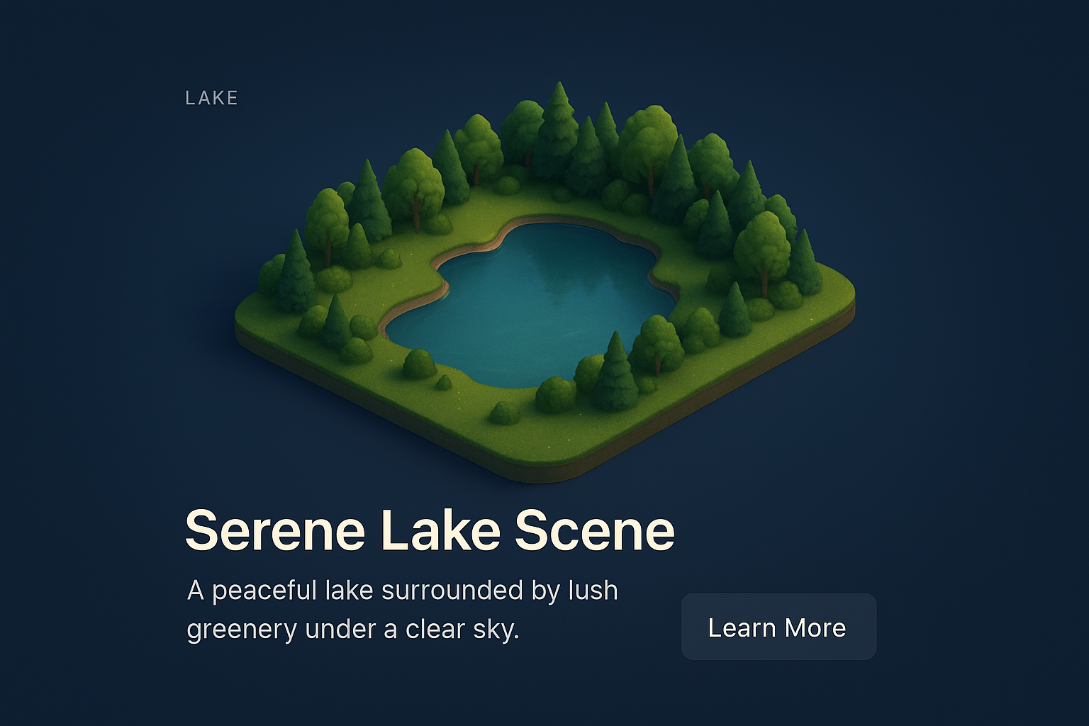 A tranquil lake scene featuring a small, vividly colored lake surrounded by lush greenery and a clear sky, designed with a 3D realistic style.