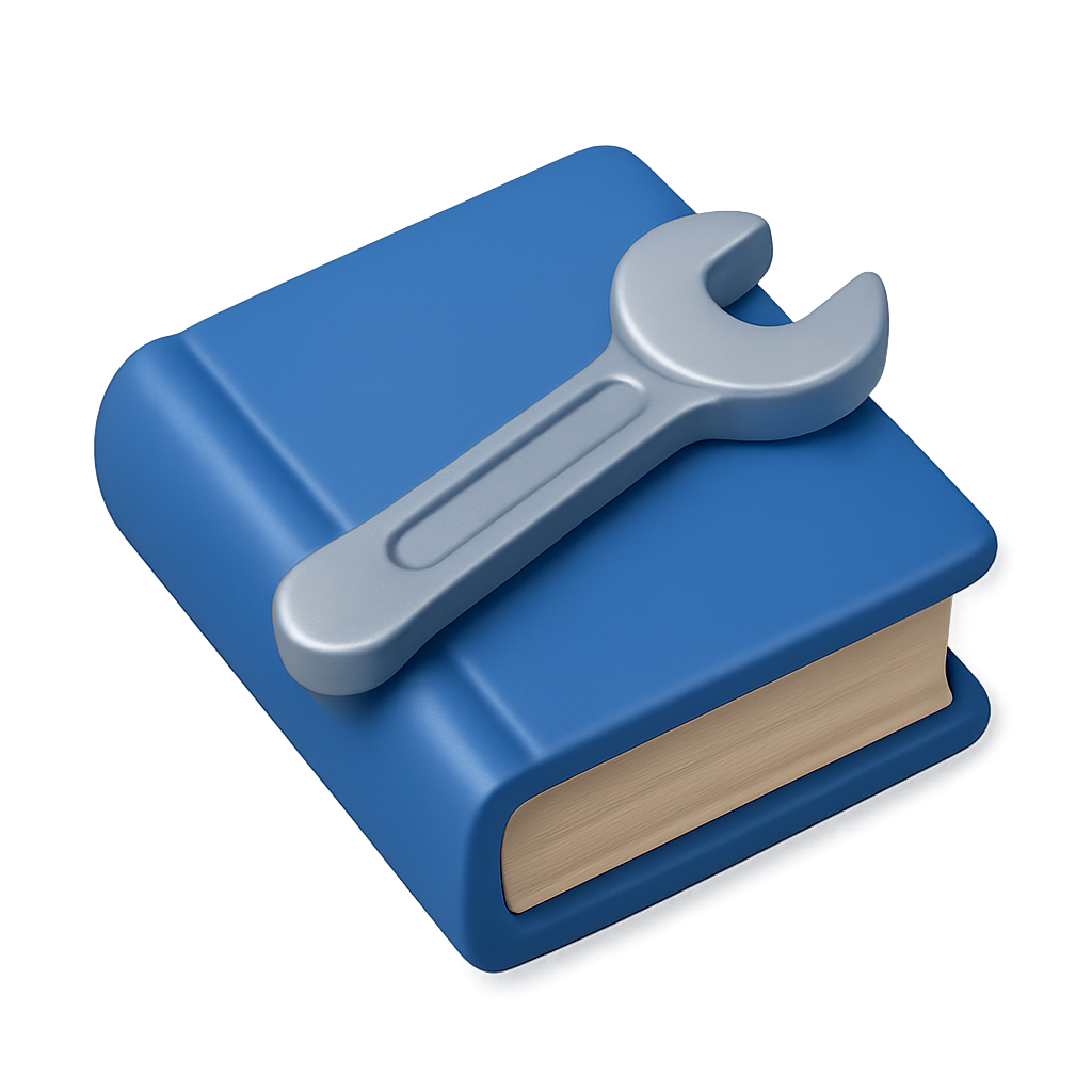 A stylized 3D render of a blue book with a metallic wrench placed on top, set against a soft gradient background. The design emphasizes a modern, isometric view.
