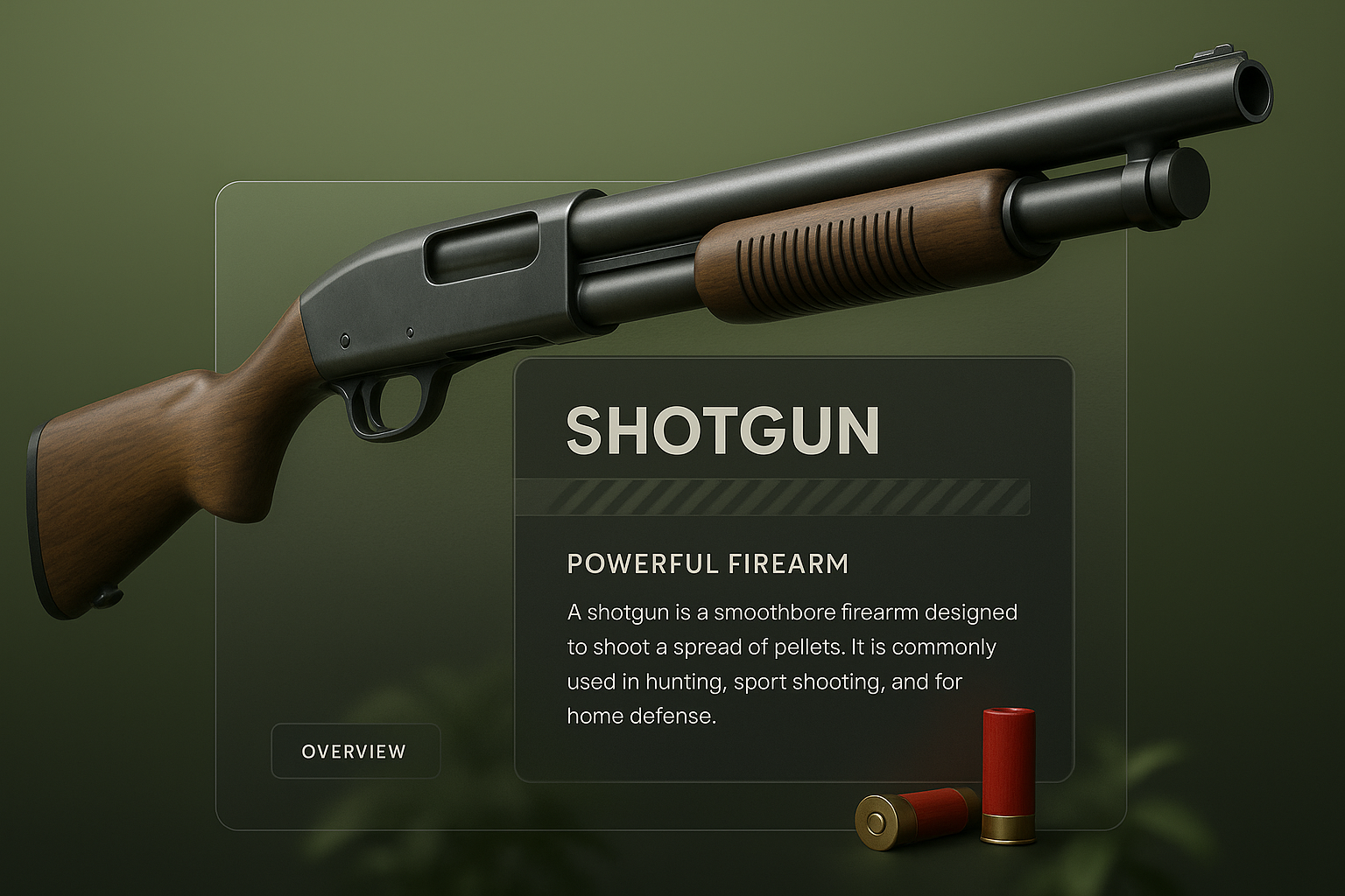 A 3D rendered shotgun is showcased against a smooth gradient background. The design includes integrated informational blocks with a sleek dark panel, highlighting its features and usage.