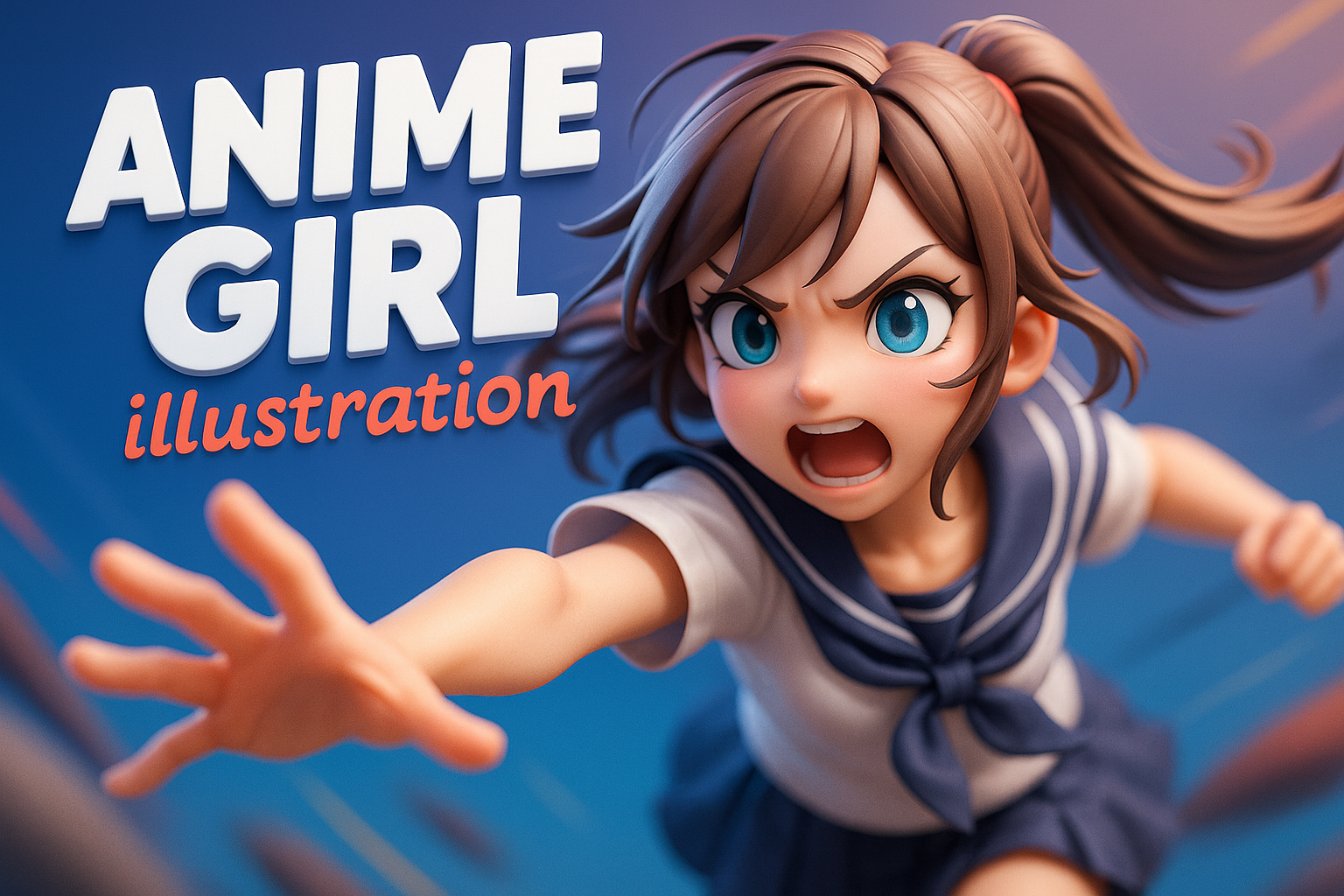 Dynamic 3D Anime Girl Illustration with Bold Typography