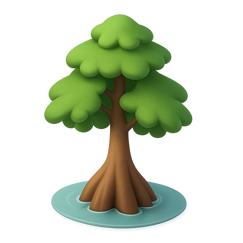 A vibrant 3D illustration of a cypress swamp tree, featuring a stylized trunk and lush green foliage, set against a subtle gradient background.