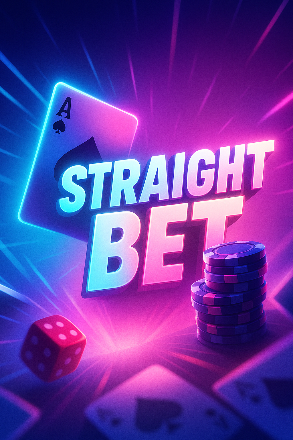/Collection: /by davooda/Type: PNG/A vibrant neon-themed scene showcasing a playing card, dice, and poker chips. The design features dynamic light effects and a focus on the text 'STRAIGHT BET' in bold, colorful typography.