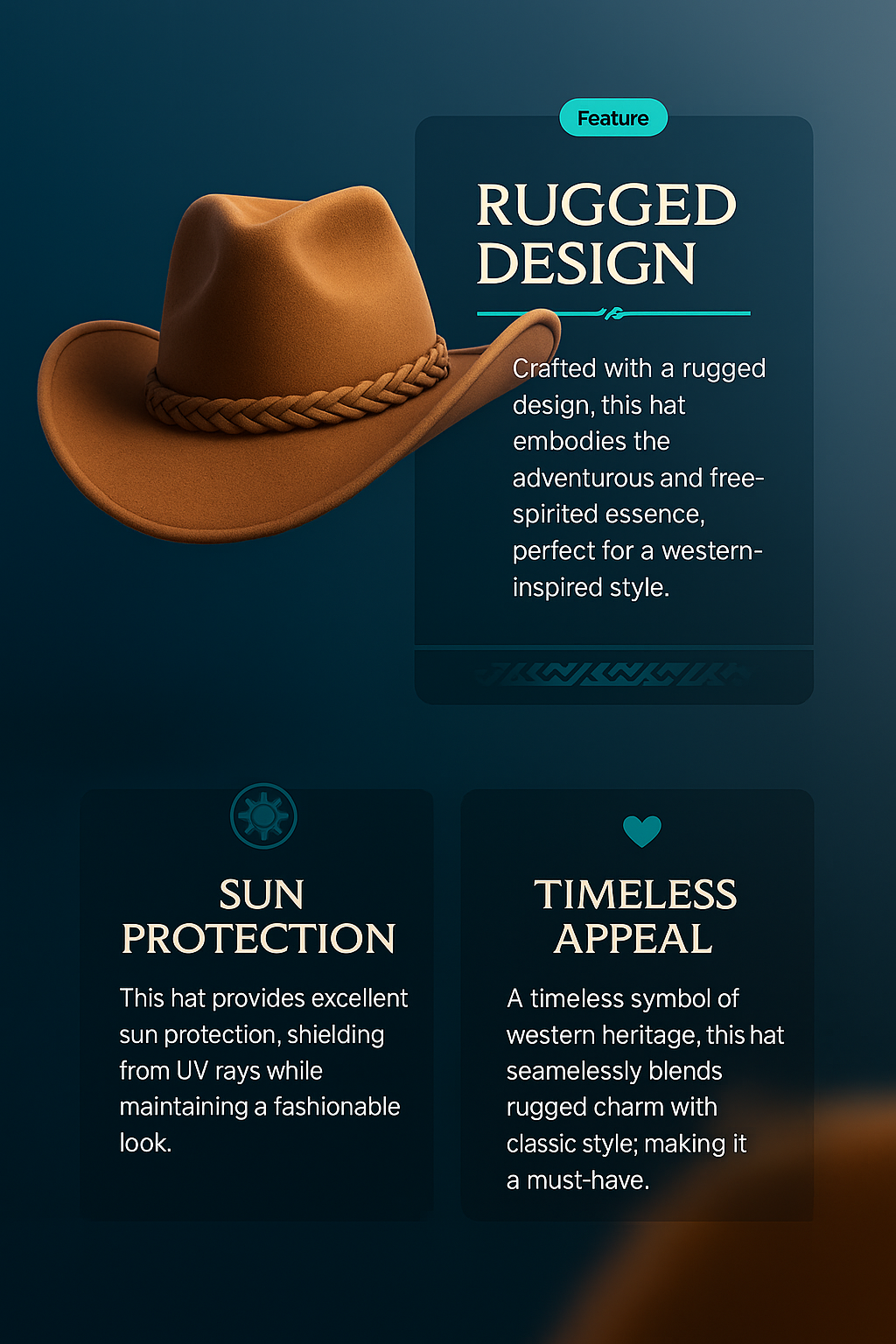 A 3D illustration of a rugged cowboy hat, accompanied by feature highlights. The design emphasizes sun protection and timeless appeal, set against a smooth gradient background.