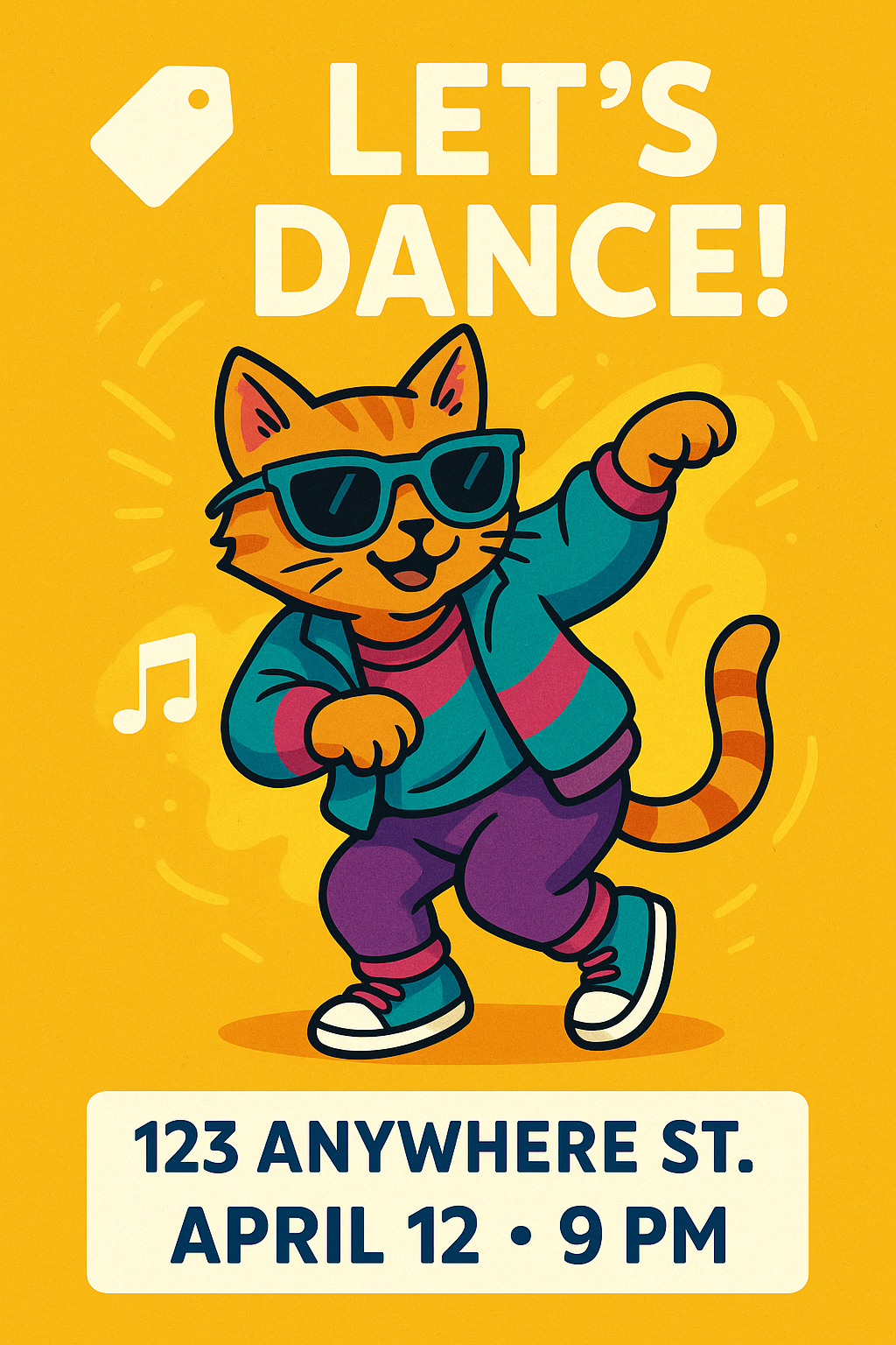 Vibrant party invitation graphic showcasing a cartoon cat in sunglasses and colorful attire, perfect for a fun and lively event announcement.