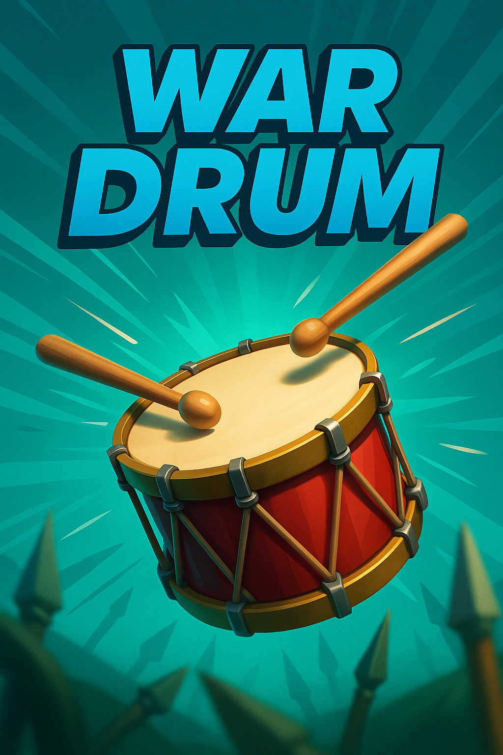 A vibrant 3D illustration of a war drum, featuring dynamic rays emanating from the center. The bold title 'WAR DRUM' is prominently displayed above the drum, creating an engaging visual impact.