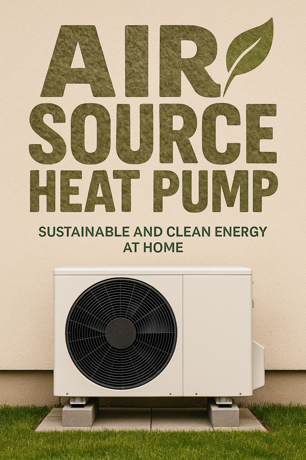 /Collection: /by davooda/Type: PNG/Informative graphic showcasing an air source heat pump against a neutral background, emphasizing sustainability and clean energy for home use. Ideal for eco-friendly marketing.